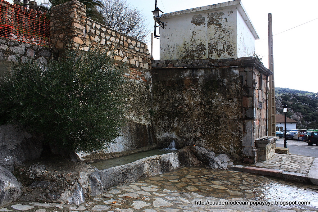 En Benaocaz, los alrededores de la fuente Allá estaban en obras el 29 de enero pasado, cosa que yo no sabía cuando decidí acercarme a la fuente para hacer fotos de los rostros de sus cuatro caños, el caso es que como había llovido copiosamente durante la semana anterior, imaginé que los chorros de los caños llegarían a la mitad de la calle... y no me equivoqué, dos de los chorros llegaban a la mitad de la calle, no así otros dos a los que les habían enchufado tubos corrugados que reconducían el agua a la pila principal, de ahí el agua seguía por los abrevaderos laterales hasta caer en un desagüe que llevaba el agua por debajo de la calle hasta un aliviadero al arroyo. Posiblemente los trabajadores de la obra, hartos de que el agua se les colase en la zanja que estaban haciendo en la calle, tomaron esta poco estética medida. Así que no pude hacer unas buenas fotos de cada uno de los rostros de los caños, debido a que los tubos corrugados afeaban bastante a la pintoresca fuente, de todas formas, debido a la fuerza del agua, tampoco me hubiese podido acercar mucho a los caños para fotografiarlos sin mojarme.